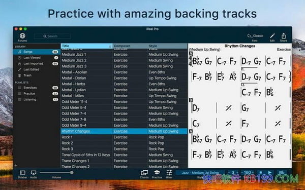 熟能生巧。快吧软件官网分享的iReal Pro破解版提供了易于使用的工具,帮助所有级别的音乐家掌握他们的艺术。它模拟一支音色逼真的乐队,在您练习的时候为您伴奏。这个应用也让您创建和收集您喜爱的歌曲的弦图表以作为参考。
