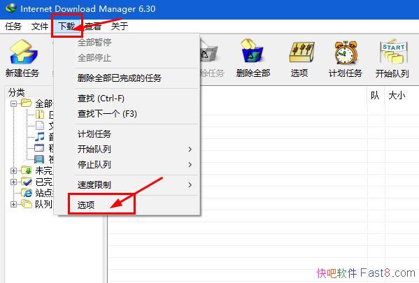 第一步:启动Internet Download Manager,点击“下载”菜单里的“选项”,如下图: |