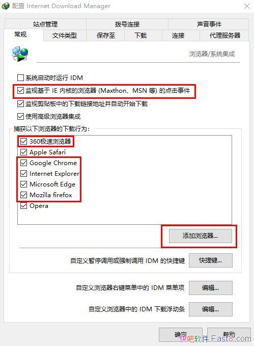 第二步:选中“监视基于IE内核的浏览器的点击事件”选项,并在“捕获以下浏览器下载行为”里添加您常用的浏览器,点击“确定”按钮设置完成后重启浏览器和IDM。进入网盘下载页面,点击“普通下载”自动弹出IDM,即可高速稳定下载。如果不行,继续往下看。 |