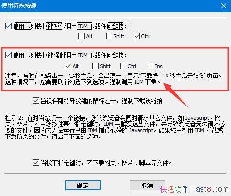 第四步:如下图,按自己需要设置强制使用IDM下载快捷键,本例设置快捷键为“ALT”键。点击确定即可。 |