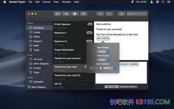 Rocket Typist 是Mac平台上的一款增强型文本快速输入工具。我们可以利用Rocket Typist Mac版预先设置保存好很多日常生活学习或是工作中常用的文本片段,还能设定部分内容为变量。