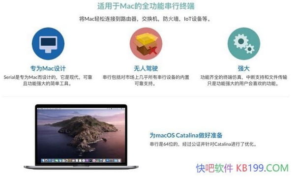 快吧软件官网分享的Serial破解版是一款串口通讯工具,可以帮助Mac用户管理和控制串口设备。它支持多种串口设备,包括Modem、GPS接收器、传感器、机器人和其他电子设备。快吧软件软件提供的Serial for Mac破解版提供了一个易于使用的界面和丰富的功能,可以让用户轻松地配置串口参数、发送和接收数据、监视串口通信等。此外,快吧软件分享的Serial Mac破解版还支持自动连接和断开连接功能,可以根据需要自动打开和关闭串口连接。总之,Serial for Mac是一款功能强大的串口通讯工具,可以帮助Mac用户轻松管理和控制串口设备。