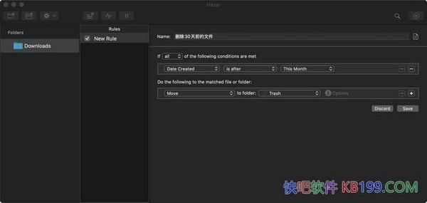 Hazel mac破解版是快吧软件搜集到的Mac os系统上一款自动清理软件,同时也是您个人的管家,可以管理您的卸载程序。按照文件的名称、种类、日期、地点或电子邮件地址,你可以设置色标签关键字和评论,清除残留下来的子文件。快吧软件官网分享的Hazel for Mac破解软件也可以管理您的Mac电脑垃圾桶和卸载应用程序。Hazel破解版能根据您所设定的规则自动组织管理你的文件。它类似苹果邮件界面应该能让您有种宾至如归的感觉。此外,Hazel for Mac破解软件可以为您管理你的垃圾桶,减轻您不必清空。