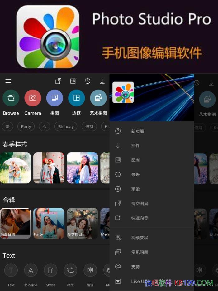 超过200个独特的滤镜,惊人的特效,大量的画中画效果,丰富的各种框架,适合您生活中的任何事件,大量的贴纸,纹理,形状和修正工具 - 照明调,色彩校正,锐化,镜头增强,倾斜移位,模糊等。使用手动校正工具突出显示,修复或改善照片上的任何部分或对象。使用蒙版修正工具有选择地应用滤镜,效果或调整照片。拼贴编辑器允许将几张照片组合成令人惊叹的照片拼贴画,其中包括各种可调节框架,形状,可自定义背景,模板和贴纸。魔术工具,包括以下突出特点:混合功能,使用大量蒙版,背景和混合模式将两个图像组合在一起; Color Splash旨在突出照片上的物体;克隆图章用于复制对象,更改或删除背景;形状编辑器有助于将照片与形状,纹理和背景的多种变体相结合。令人印象深刻的文本编辑工具旨在通过丰富的可自定义字体,颜色,纹理和形状集合在您的照片上创建漂亮的信息。大约50个附加内容包,使用新效果,框架,纹理,字体和模板扩展照片编辑过程。我们的团队不断努力实施新的惊人功能,以获得#1照片编辑器称号。