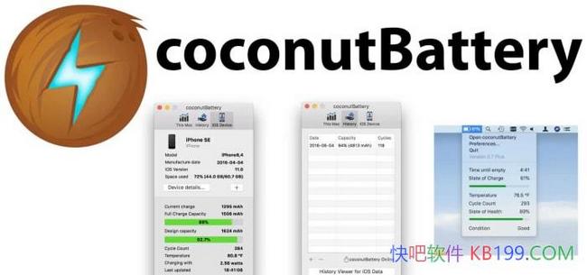CoconutBattery for mac是macOS平台上的一款帮助用户精确电池寿命的Mac电池管理软件,可以快速查看MacBook电池信息和查询iOS设备的电池信息的软件。此外,我们还可以利用coconutBattery随时记录自己电池的状态以及各种参数。coconutBattery的图标就是一个有闪电符号的椰子,也就是名称中coconut的意思。coconutBattery的应用非常简单,可以独立运行查看电池信息,程序打开后没有任何后台,也不会常驻在菜单栏种。主界面下我们可以查看到MacBook的型号,生产时间,代号目前的电池容量等。此外,还可以看到电池的生产时间,循环周期、电池状态、电池温度,是否正在充电等信息。coconutBattery的主界面包括信息和历史两个功能。在信息界面还可以查看Mac和电池的详细信息。