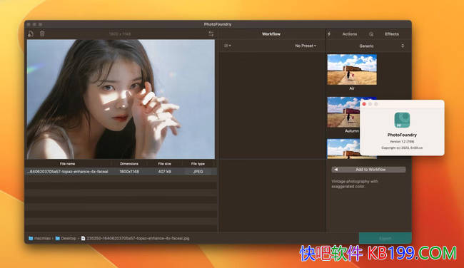 hotoFoundry for Mac是马克喵收集到的一款强大的图像处理软件,专为Mac用户设计。它具有丰富的功能,包括图像编辑、滤镜效果、图层管理、调整色彩等,可以满足专业和非专业摄影师的需求。用户友好的界面使操作变得简单直观,即使初学者也能轻松上手。此外,该软件支持多种文件格式,如JPEG、TIFF、PNG等,并支持输出为Web所用格式。PhotoFoundry还具有强大的自动化功能,如批量处理和自动调整,大大提高了工作效率。总之,PhotoFoundry for Mac是一款功能全面、操作简便的图像处理软件,适合所有类型的摄影师使用。