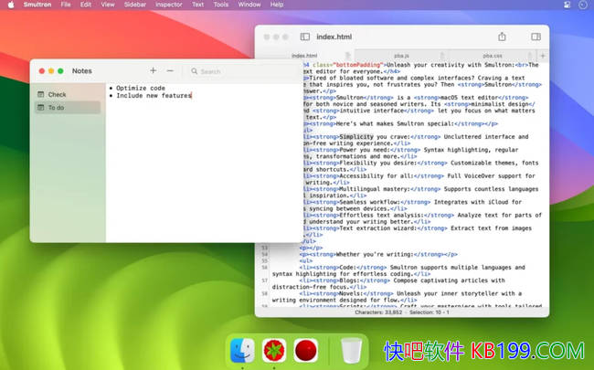 Smultron for Mac一款真正为 macOS 用户量身打造的文本编辑器,兼具轻量与实用,适用于从日常写作到专业编程等多种场景。它没有臃肿的功能堆砌,也无需繁琐的设置,只需安装即可上手,真正实现“编辑即高效”。您几乎可以使用 Smultron 编写从网页、脚本、待办事项列表、小说到整个应用程序的所有内容。